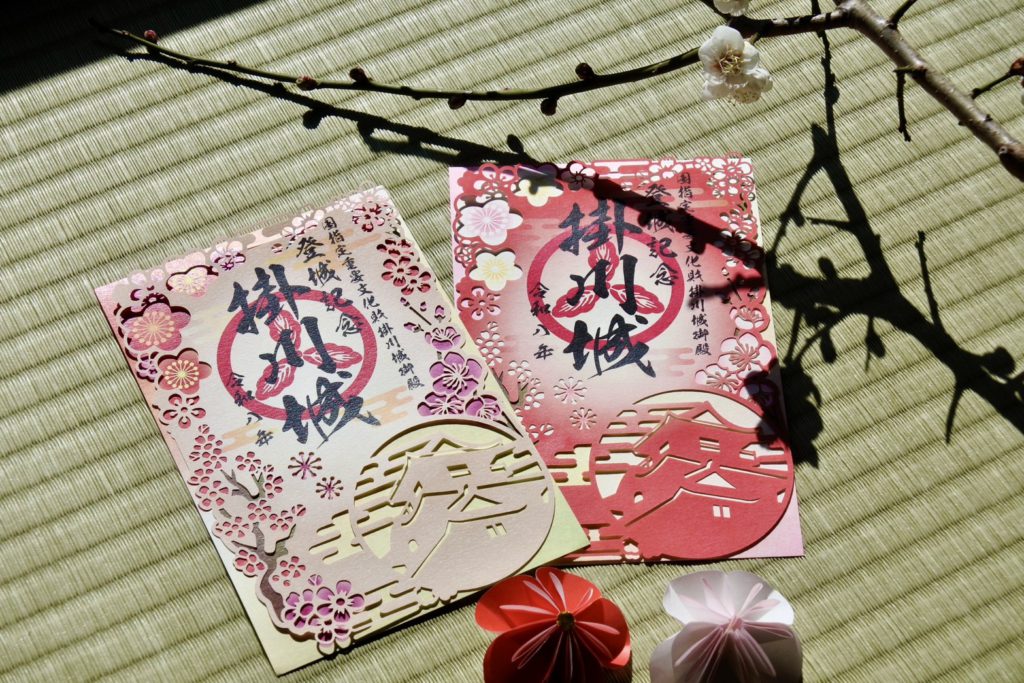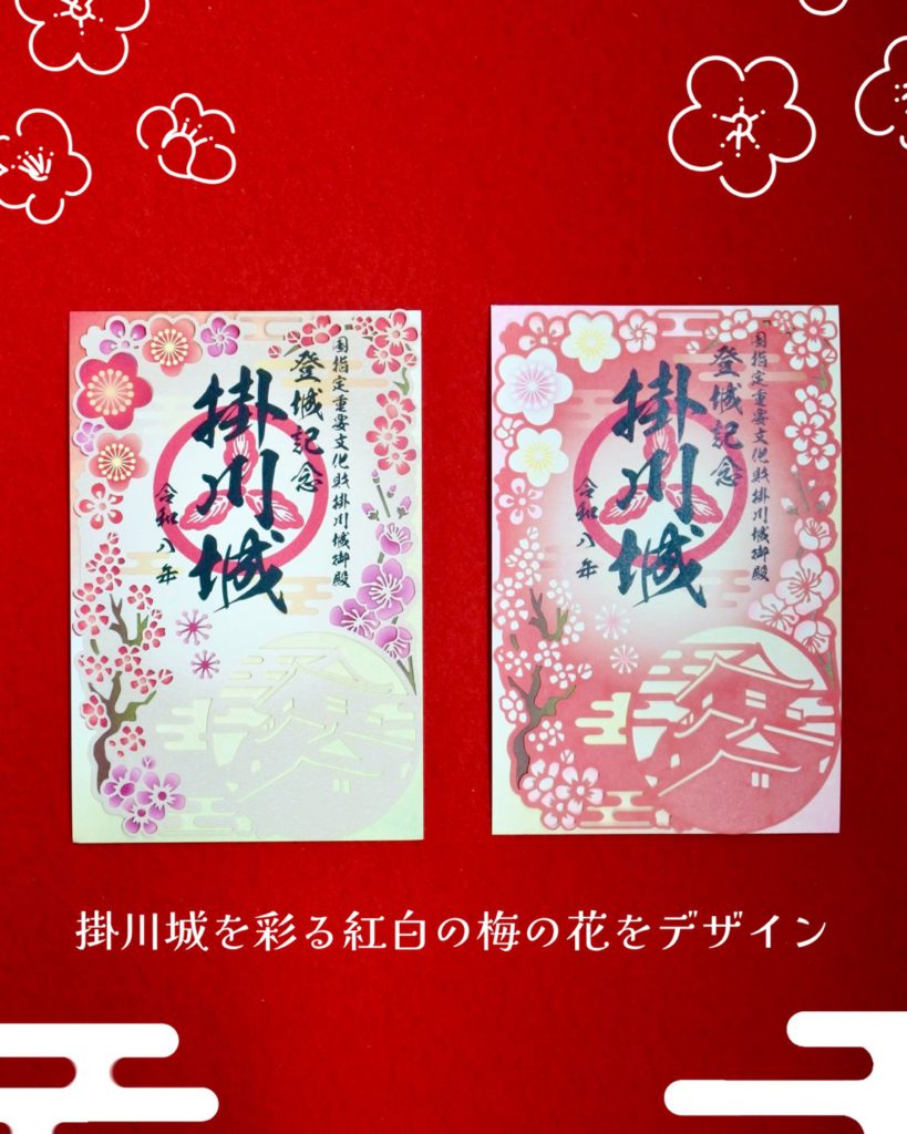 今回の御城印は、紅白の梅の花が彩る掛川城天守閣をデザインした2種類をご用意いたしました。