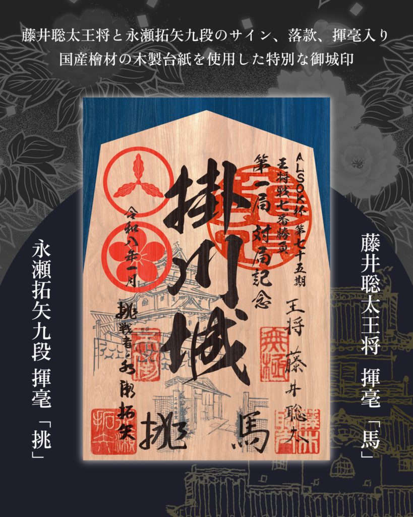 御城印には第75期王将戦の対局棋士である藤井聡太王将と挑戦者・永瀬拓矢九段のサイン、揮毫、落款をデザイン。